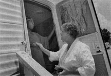 HELPING HAND: Sister Judith Brun, a nun coordinating assistance at Renaissance Village, checks in on resident Theresa August on the last day before the FEMA deadline. |